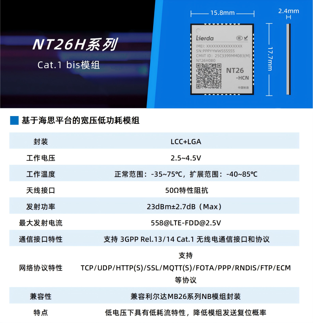 还在纠结宽压与低功耗怎么选?利尔达NT26H系列Cat.1 bis模组一次满足!