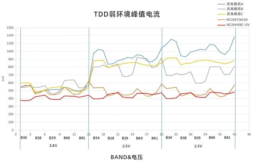 即使在设备电池电量耗尽、电压跌落至2.5V的临界状态下,NT26H仍能保持433mA~550mA的优异工作电流,显著低于业界同类产品550mA~1.2A的常见水平。这意味着在电池寿命末期,设备运行更稳定,有效通信时间更长。