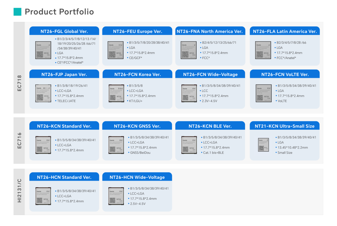 针对海外市场需求,继NT26-FEU欧洲版、NT26-FJP日本版之后,利尔达又重磅推出了三款Cat.1 bis模组新品——NT26-FGL全球通版、NT26-FNA北美版、NT26-FLA拉美版,旨在为全球客户提供更灵活、更具竞争力的连接解决方案,助力企业高效拓展海外市场。